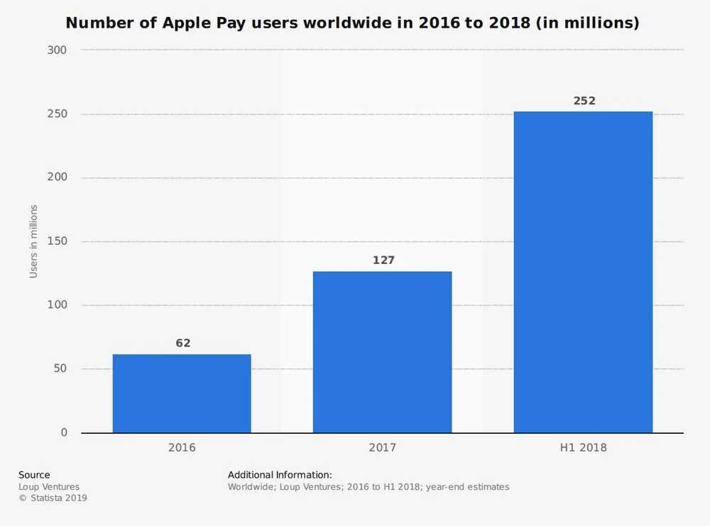 Damit hätte Apple (und Goldman Sachs) schon einmal eine erste Erlösquelle. Am Ende ist die Kreditkarte eine Erweiterung zu Apple Pay, um mit der riesigen Kundenbasis (1,4 Milliarden Geräte im Umlauf, circa eine Milliarde unique Kunden) mehr Erlöse zu generieren. Mit Apple Pay ist der Konzern bereits gut unterwegs. Laut Loup Ventures zählte Apple zum ersten Halbjahr 2018 252 Milllionen Apple Pay Nutzer. Mittlerweile dürften es mehr als 300 Millionen sein. Optimistische Schätzungen gehen von 383 Millionen aus.