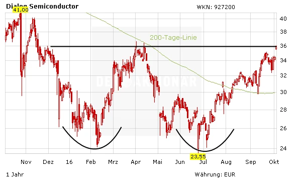 Seit Juli befinden sich die Papiere von Dialog im Aufwärtstrend und notieren deutlich oberhalb der 200-Tage-Linie. Bei einem Ausbruch über die Marke von 36 Euro wird die große W-Formation aktiviert – es ergibt sich somit ein Kursziel im Bereich von 42,50 Euro. Mutige Anleger greifen noch vor dem Kaufsignal zu.