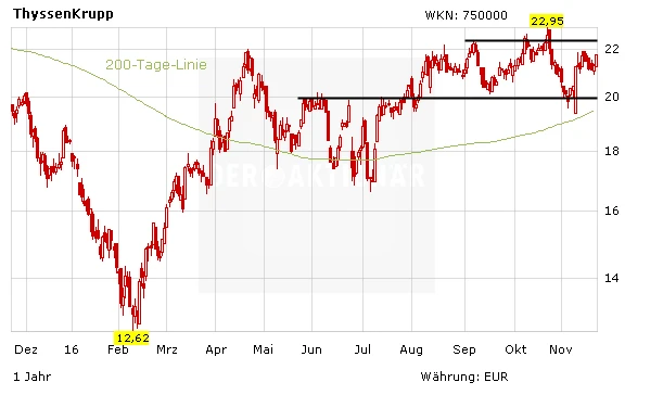 Am Donnerstag, den 23. November, präsentiert ThyssenKrupp seine Quartalszahlen. Hier werden einige Antworten auf die offenen strategischen Fragen erhofft. Fallen Ergebnisse und Prognose aus, könnte die Attacke auf das Jahreshoch bei 22,95 Euro beginnen. Der Sprung über diese Marke wäre ein neues Kaufsignal. DER AKTIONÄR favorisiert ThyssenKrupp aufgrund der breiteren Aufstellung gegenüber Salzgitter. Wer investiert ist, zieht bei Salzgitter den Stopp auf 24 Euro nach. Bei ThyssenKrupp liegt der Stoppkurs bei 17,50 Euro.