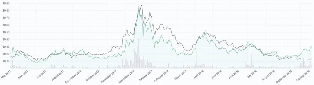 Auf Monatssicht hat sich der Preis des ERC20-Token nahezu verdoppelt. Der starke Anstieg ist zum Teil mit dem „Coinbase-Effekt“ zu erklären. Vor wenigen Tagen gab die Krypto-Plattform bekannt, dass BAT gelistet wird. In der Regel erfahren Kryptowährungen, denen ein Listing bei Coinbase bevorsteht, starke Kurszuwächse, so auch bei BAT. Des Weiteren ist eine Abkopplung von der Mutterplattform Ethereum zu erkennen. Wie im Chart (Quelle: SanBase) zu erkennen ist, entwickelte sich der BAT-Preis fast identisch mit dem Ethereum-Preis.