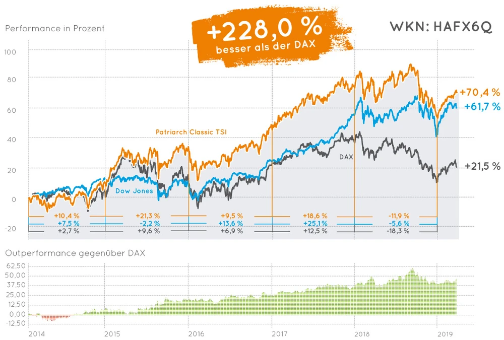 Seit der Auflage des TSI-Fonds mit der WKN HAFX6Q im Januar 2014 konnte eine Rendite von über 70 Prozent nach Abzug der Kosten erzielt werden. Der DAX hat im Vergleich dazu gerade einmal 21 Prozent zulegen können. Die langfristige Outperformance spricht hier eine klare Sprache.