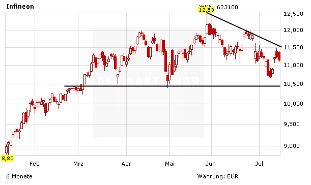 Am heutigen Dienstag haben auch die Analysten der Deutschen Bank und der Commerzbank die Titel von Infineon näher unter die Lupe genommen. Die Deutsche Bank hat die Einstufung für Infineon vor den Zahlen auf "Buy" mit einem Kursziel von 13,50 Euro belassen. Unter anderem dank des starken Geschäfts mit der Autoindustrie dürfte der Chiphersteller gute Resultate für das zweite Quartal vorlegen, schrieb Analyst Johannes Schaller in einer Studie vom Dienstag. Die Aktie der Münchener sei weiter sein Favorit im Chipsektor, den er mit "Neutral" bewertet.