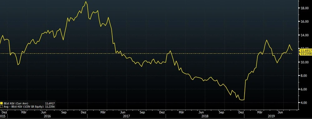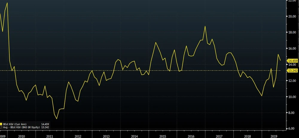 Dementsprechend sind beide DAX-Werte aktuell gemessen an ihren KGVs auch keine Schnäppchen. So liegt das aktuelle 2019er-KGV von BASF bei 14,5 und damit sogar leicht über dem 10-jährigen Durchschnitt (gestrichelte Linie):
