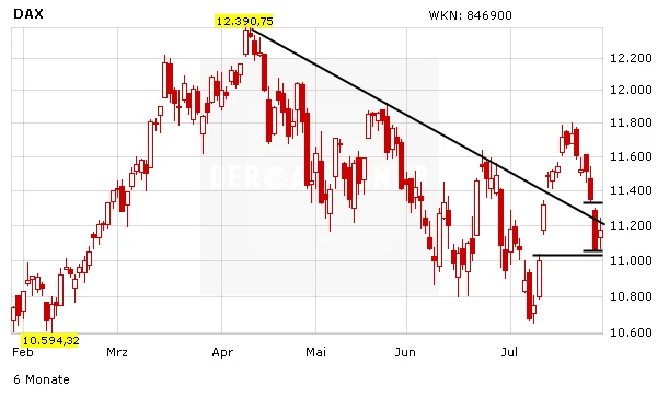 Im ungünstigsten Fall verharrt der DAX in seiner Flaggenformation, prallt an der oberen Begrenzung ab und geht in den Tauchgang über. In diesem Szenario kommt der Marke von 11.052 Zählern, dem Tief vom 27. Juli, eine besondere Bedeutung zu. Wird diese nicht verteidigt, droht nicht nur das Gap bei 11.025 Punkten geschlossen zu werden; dann dürfte auch die 11.000-Punkte-Marke nicht lange halten.