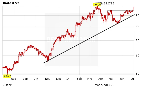 Die Biotest-Vorzüge zählten im ersten Halbjahr 2014 zu den großen Gewinnern am deutschen Aktienmarkt. Mit einem Plus von rund einem Viertel landete die Aktie in den Top-10. In Kürze könnte der nächste Schub anstehen, wenn zum ersten Mal in der Geschichte dreistellige Kurse auf der Kurstafel in Frankfurt aufleuchten. DER AKTIONÄR ist mit einem Hebelprodukt an Bord.