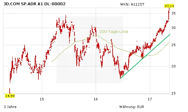 Die Aussicht auf hohe Margen und das abgeschlossene Quartal zeigen, dass sich JD mit seiner Strategie langfristig auf Wachstumskurs befindet. In Zeiten voranschreitender Digitalisierung und steigenden Konsumausgaben in China dürfte JD weiterhin Marktanteile hinzugewinnen. DER AKTIONÄR sieht im Allzeithoch bei 37,13 Euro das Ende der Fahnenstange noch nicht erreicht – Kursziel ist 46,00 Euro.