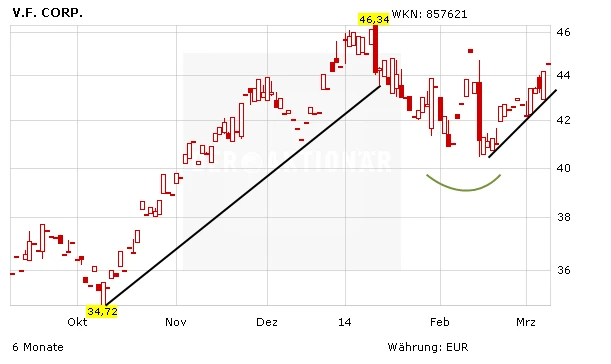 Nachdem die Aktie Anfang 2014 noch auf ein neues Allzeithoch von 46,34 Euro kletterte, fiel das Papier im Zuge der letzten Zahlen auf 41,00 Euro zurück. In den letzten Tagen kämpfte sich die Aktie aber wieder zurück. Fazit: Der langfristige Aufwärtstrend ist intakt, die Gewinnaussichten für die nächsten Jahre sind vielversprechend. Für Anleger, die etwas ruhiger an der Börse agieren möchten, eignet sich die Aktie der V.F. Corporation als Langfristanlage.