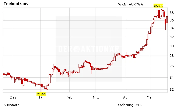Die Technotrans-Aktie hat in den letzten Tagen Fahrt aufgenommen. Nach einer kurzen Abkühlung dürfte der Kurs den Trend wieder aufnehmen. Anleger setzen einen ersten Fuß in die Tür und komplettieren die Position um 33 Euro.