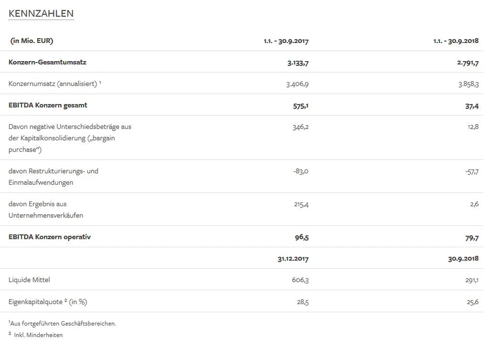 Der Konzerngesamtumsatz liegt mit 2,8 Milliarden Euro leicht unter dem Vorjahreswert (3,1 Milliarden Euro). Der Grund: In 2017 erfolgten Veräußerungen umsatzstarker Beteiligungen. Trotzdem liegt das operative EBITDA bei rund 80 Millionen Euro.