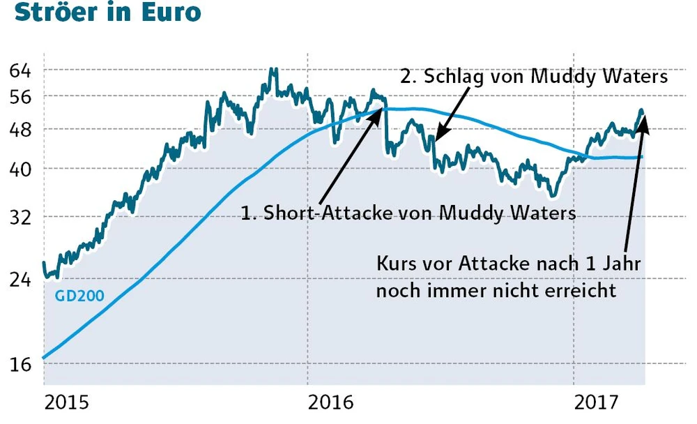 Daher und wegen der hohen Wahrscheinlichkeit einer weiteren Attacke - heute läuft bereits die zweite Welle an - ist aus marktstrategischer Sicht von einem Kauf abzuraten, auch wenn er fundamental gerechtfertigt wäre. Wie auch die Fälle Ströer (siehe Chart) und Wirecard zeigen, dauert es mitunter etwas länger, bis der Markt wieder Vertrauen aufbaut.
