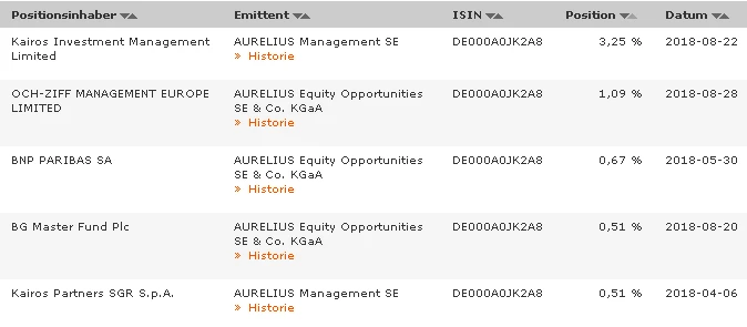 Neben der in London ansässigen Gesellschaft ist eine weitere Kairos-Gesellschaft mit Sitz in Mailand als Leerverkäufer mit 0,51 Prozent eingestiegen. Weiterhin sind die OCH-ZIFF Management Europe Limited, welche zuletzt ihre Position minimal verringerte, die BNP Paribas SA sowie die BG Master Fund Plc mit von der Partie. Insgesamt halten die Shortseller derzeit Netto-Leerverkaufspositionen in Höhe von 6,03 Prozent der Aurelius-Aktien.