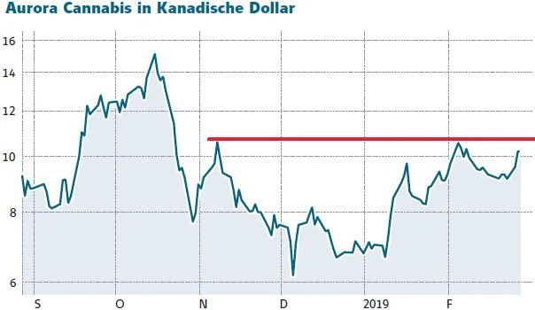 Was für ein starker Auftritt von Aurora Cannabis am gestrigen Dienstag. Das Papier ging an der Heimatbörse in Toronto mit einem Plus von 6,4 Prozent aus dem Handel. Damit steuert die Aktie nun direkt auf den wichtigen Widerstand bei knapp elf Kanadischen Dollar zu. Dieser resultiert aus den Zwischenhochs vom November 2018 und Februar 2019. Gelingt der Aktie der Sprung darüber, wären dies ein klares Kaufsignal und der Weg frei in Richtung Allzeithoch. Dieses wurde im Oktober vergangenen Jahres bei 16,24 Kanadischen Dollar erzielt.
