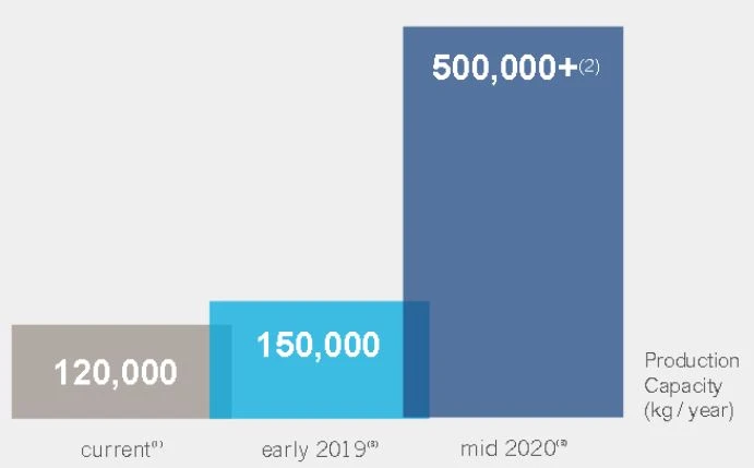 Erwartete Entwicklung der Produktionskapazität von Aurora Cannabis (Quelle: Aurora Cannabis)