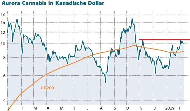 Im Zuge der immer weitergehenden Legalisierung von Cannabis, hat die gesamte Branche in den vergangenen Wochen ihr Comeback gefeiert. Auch die Aktie von Aurora Cannabis hat seit ihrem Dezembertief bei 6,21 Kanadische Dollar deutlich zugelegt. Zwischenzeitlich ging es mehr als 70 Prozent nach oben. Derzeit hängt der Wert aber am Widerstand in Form des Novemberhochs 2018 fest. Zudem präsentieren sich die Anleger im Vorfeld der Veröffentlichung der Zahlen für das zweite Quartal (per 31.12.) des vergangenen Geschäftsjahres etwas zurückhaltend. Diese werden heute Abend veröffentlicht. Der Conference Call findet am 11. Februar, 18 Uhr Eastern Time (24 Uhr MEZ) statt. Anleger bleiben weiter investiert, sichern ihre Positionen aber mit einem Stopp im Bereich von acht Kanadischen Dollar, umgerechnet etwa 5,30 Euro, ab.