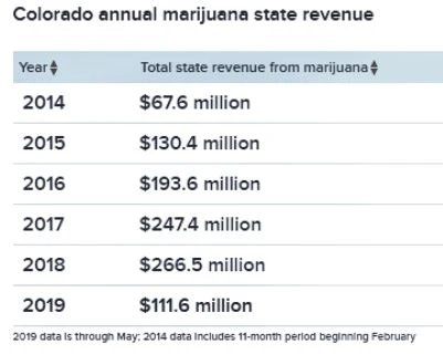 Seit Juli 2017 sind die monatlichen Steuer- und Gebühreneinnahmen aus dem Verkauf von Marihuana in Colorado nie unter 20 Millionen Dollar gesunken. Im Februar 2014, dem ersten Monat mit Umsatzdaten, belief sich der Gesamtumsatz des Staates auf 3,5 Millionen Dollar.