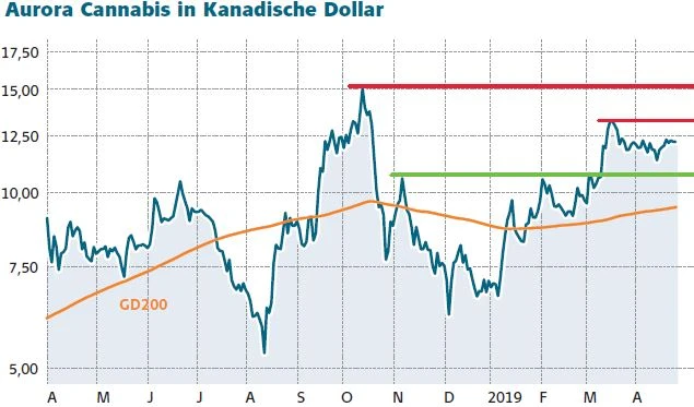 An der Börse wird die Expansionsstrategie von Aurora Cannabis honoriert. Seit dem Dezembertief 2018 bei 6,21 Kanadischen Dollar hat sich die Aktie mittlerweile rund verdoppeln können. Gelingt der Sprung über das Märzhoch 2019 bei 13,67 Kanadischen Dollar, würde dies ein neues Kaufsignal für die Aktie bedeuten. Dann wäre der Weg frei in Richtung Allzeithoch, das im Oktober vergangenen Jahres bei 16,24 Kanadischen Dollar markiert wurde. Nach unten bietet die Marke von elf Kanadischen Dollar eine gute Unterstützung. Anleger lassen ihre Gewinne bei der Aktie weiter mit einem Stopp bei 6,40 Euro (9,60 Kanadische Dollar) laufen.