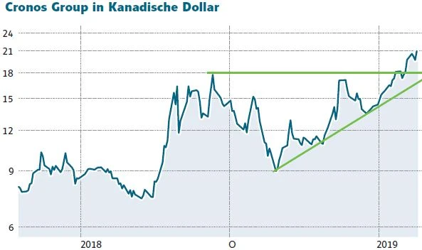 Ebenfalls extrem stark hat sich am Donnerstag die Aktie der Cronos Group entwickelt. 6,6 Prozent ging es nach oben auf 21,00 Kanadische Dollar. Der Wert erreichte mit dem jüngsten Kursanstieg sogar ein neues Allzeithoch. Seit dem Einstieg von Altria Anfang Dezember 2018 ging es bei dem Papier kräftig nach oben. Mittlerweile notiert Cronos deutlich über dem Preis, den Altria bezahlt hat (16,25 Kanadische Dollar je Aktie). Auch die Warrants, die Altria bei 19,00 Kanadische Dollar ausüben kann, befinden sich bereits im Plus. Günstig ist Cronos nach dem jüngsten kräftigen Kursanstieg mittlerweile nicht mehr. Bei der Bewertung hat das Papier sogar Tilray mittlerweile deutlich überholt. Bei Cronos wird mittlerweile der 266-fache Umsatz bezahlt, bei Tilray ist es im Vergleich der 155-fache Umsatz.