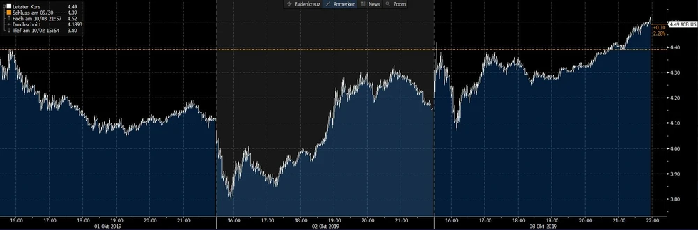 Das Update findet an der Börse Anklang. Am 02. Oktober wurde die Aktie bis auf 3,80 US-Dollar durchgereicht, um im Anschluss sogar ins Plus zu drehen. Mit dem Update setzte sich gestern die kräftige Erholungsbewegung bei den Papieren von Aurora Cannabis fort.