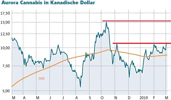 Die Aktie von Aurora Cannabis hat am Dienstag in Kanada massiv zulegen können. Am Ende ging das Papier mit einem Plus von 12,5 Prozent auf 10,80 Kanadische Dollar aus dem Handel. Damit befindet sich der Wert nur noch ganz knapp unter dem Februarhoch 2019, das bei 10,94 Kanadische Dollar markiert wurde. Ein Sprung darüber würde aus charttechnischer Sicht den Weg frei machen in Richtung Allzeithoch, das im Oktober vergangenen Jahres bei 16,24 Kanadische Dollar markiert wurde.