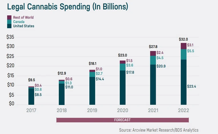 Gemessen am Umsatzpotenzial ist die Legalisierung von Cannabis in Kanada und anderen kleineren Nationen wie Uruguay ein Tropfen auf den heißen Stein. Der Fokus dürfte in den kommenden Jahren auf Legalisierungsbestrebungen in den USA und Europa liegen. Die Analyse prognostiziert allein in den Vereinigten Staaten einen Anstieg auf 23,4 Milliarden Dollar bis 2022, das Umsatzpotenzial im Rest der Welt wird auf 8,6 Milliarden Dollar geschätzt.
