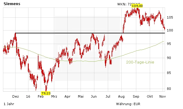 Bedingt durch den schwachen Gesamtmarkt trübte sich das Chartbild der Siemens-Aktie in den vergangenen Handelstagen ein. Investierte Anleger bleiben trotzdem an Bord und sichern ihre Position mit einem Stopp bei 95 Euro ab.
