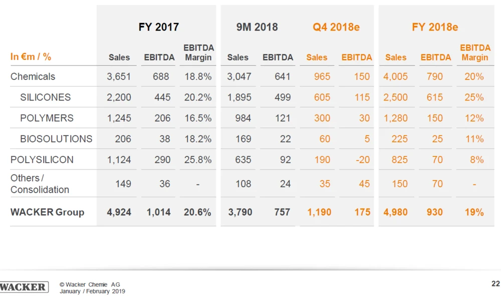 Im US-Werk waren aufgrund einer Explosion 2017 erhebliche Schäden entstanden. Wacker musste die Polysilizium-Produktion unterbrechen. Die Instandsetzung der Produktionsanlagen in Charleston ist abgeschlossen. „Anfang Dezember letzten Jahres haben wir dort wieder die volle Kapazität erreicht“, so Staudigl. „Wir gehen unverändert davon aus, dass die Versicherungsleistungen den vollen Schaden aus der Instandsetzung der Anlagen und der Betriebsunterbrechung im Laufe des Jahres abdecken werden“, führt der Firmenlenker aus.