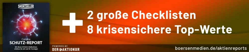 Ich riet im Shortseller-Börsenbrief in den letzten Wochen mehrmals zu einem Ausstieg aus den Aktienmärkten und legte am vergangenen Freitag das neue Short-Crash-Depot auf, was sich seit diesem Zeitpunkt erfreulich entwickelte. Um nun weitere Chancen an den Kapitalmärkten wahrzunehmen, habe ich mich dazu entschlossen, den Corona-Schutz-Report zu schreiben. Dieser enthält ein Krisenschutz-Portfolio mit acht aussichtsreichen Werten sowie zwei 10-Punkte-Pläne gegen eine Pandemie sowie zum Thema Vermögensschutz. Mit enthalten in dem Report: Einige Corona-Impfstoffaktien, die über beträchtliches Kurspotenzial verfügen.