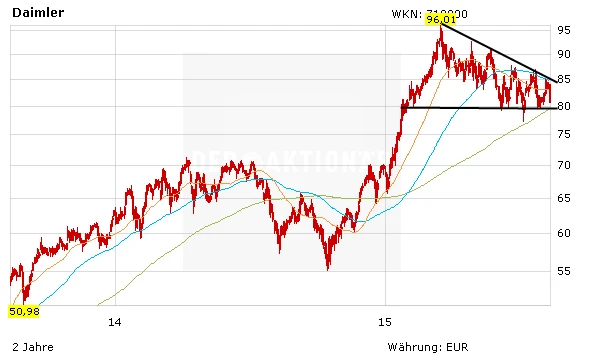 Es bleibt dabei: Daimler ist nach wie vor der Favorit unter den deutschen Autobauern. Durch den erneuten Rücksetzer nähert sich die Aktie wieder der Unterstützungszone zwischen 80 und 82 Euro. Auf diesem Niveau kann die Position aufgestockt werden. Aufwärtspotenzial ergibt sich erst wieder, wenn der mittelfristige Abwärtstrend nach oben geknackt wird.