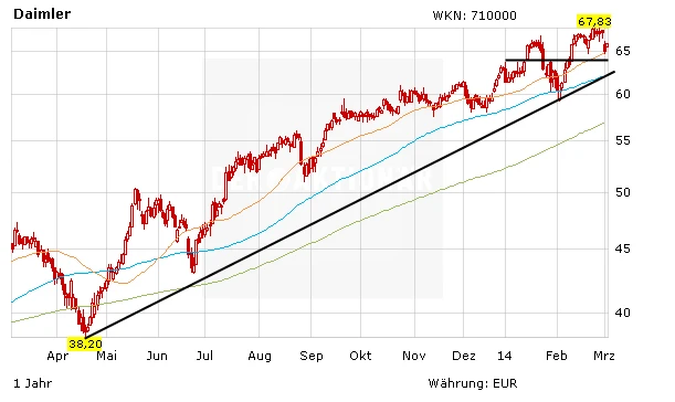 Beide Autobauer sind gut im Rennen. Etwas dynamischer zeigt sich das Papier von Daimler. Die Aktie hat den Dax in den letzten Wochen deutlich hinter sich gelassen und glänzt mit Relativer Stärke. Rücksetzer sollten zum Kauf genutzt werden. Ein Auffanglimit kann bei 62,50 Euro platziert werden.