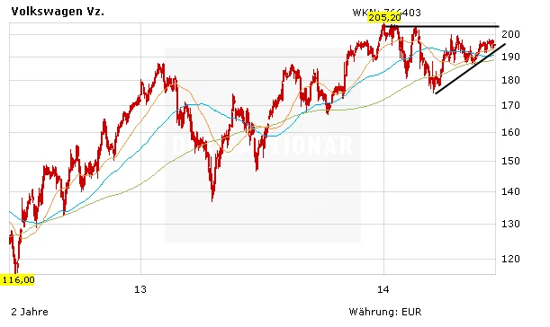 Die Aktie glänzt mit Relativer Stärke. Darüber hinaus läuft das Papier in einem schönen Aufwärtstrend nach oben. Sofern der Ausbruch über das alte Hoch bei 71,25 Euro klappt, ist der Weg vorerst bis 75 Euro frei. BMW dagegen hat nach dem Rücksetzer bis auf die Ausbruchslinie auf 86 Euro wieder den Weg nach oben geschlagen. Jedoch fehlt im Gegensatz zur Daimler-Aktie die Dynamik. Ebenso bei der Aktie des VW-Konzerns. Diese scheiterte bereits mehrmals an der horizontalen Widerstandsmarke von 205,20 Euro. Erst ein Ausbruch darüber würde einen Neueinstig rechtfertigen und neues Potenzial frei setzen. Die Aktie ist derzeit eine Halteposition.