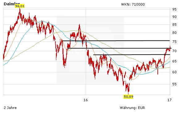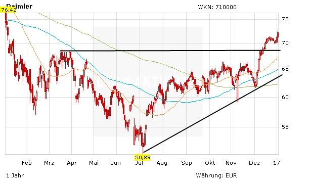 Die Börse hat die Zykliker wieder entdeckt. Die Daimler-Aktie war zuletzt sehr gefragt und hat das Hoch aus dem Monat Oktober bei 66,50 Euro geknackt. Nach einer kurzen Konsolidierung setzte das Papier den Weg nach oben fort. Der nächste Widerstand liegt im Bereich der Oktober und November Tiefs aus dem Jahr 2015 bei 74,85 Euro. Anleger bleiben auf jeden Fall investiert.