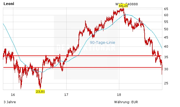 Die Leoni-Aktie krachte in diesem Jahr bereits durch zahlreiche Unterstützungen und hetzt von einem Jahrestief zum nächsten. In Zahlen: Minus 56 Prozent in diesem Jahr. Im Zuge der heutigen Warnung hält auch die wichtige Unterstützung im Bereich 30 Euro nicht. Der Titel verlor heute zeitweise mehr als sechs Prozent und rutschte auf 28,00 Euro. Doch die Erholung setzte schnell ein, das aktuelle Minus beläuft sich auf rund 1,5 Prozent.