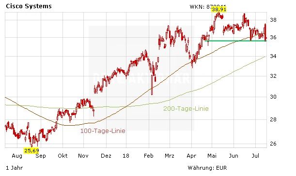 Die Aktien von Arista (minus 4,3 Prozent), Cisco (minus 4,1 Prozent) und Juniper (minus 2,3 Prozent) gerieten entsprechend unter Druck. Cisco beispielsweise erzielt die Hälfte seiner Umsätze mit Switches und Routern.