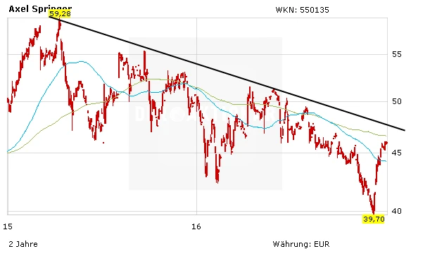 Zwar hat sich das Chartbild durch die Erholung inzwischen wieder aufgehellt, Anleger sollten vor dem Wiedereinstieg jedoch den Sprung über die 200-Tage-Linie bei 46,61 Euro sowie den Ausbruch aus dem mittelfristigen Abwärtstrend im Bereich von 47,50 Euro abwarten.