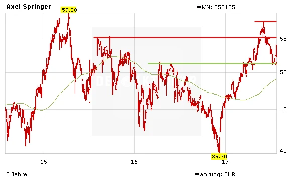 Die Springer-Aktie reagiert am Dienstag mit einem deutlichen Kursplus auf die Hochstufung. Nachdem der Kurs in den vergangenen Wochen mehr als zehn Prozent eingebüßt hatte, scheint die Korrektur nun beendet und die Bodenbildung im Bereich der Unterstützung bei 51,25 Euro abgeschlossen.