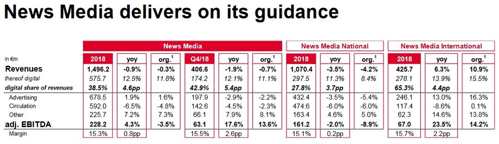 Der Ausblick auf 2019 fiel dennoch verhalten aus. Der Medienkonzern rechnet für 2019 mit einem Umsatzwachstum im niedrigen, einstelligen Prozentbereich. Der bereinigte operative Gewinn (EBITDA) soll auf Vorjahresniveau liegen.
