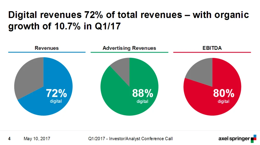 Auch in der Sparte Bezahlangebote, in der Springer die nationalen und internationalen Medien bündelt, ist der Umsatz leicht (+1,4 Prozent) und das EBITDA deutlich (+19,8 Prozent) gestiegen. Zwar wirkt sich auf nationaler Ebene der Auflagenrückgang bei BILD und WELT durch rückläufige Werbe- und Vertriebserlöse aus, insgesamt konnte das Wachstum bei den digitalen Medien die Rückgänge im Bereich Print aber mehr als ausgleichen.