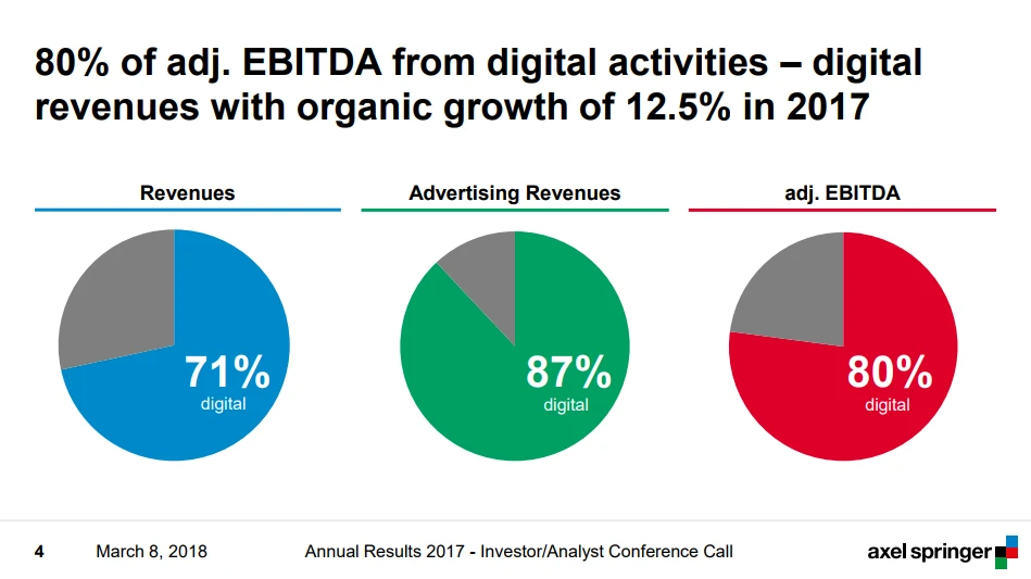 Überdurchschnittlich habe sich dabei wieder die digitalen Geschäftsmodelle entwickelt, mit denen Springer inzwischen 71 Prozent des Konzernumsatzes, 80 Prozent des bereinigten EBITDA und sogar 87 Prozent der Werbeerlöse erwirtschaftet.