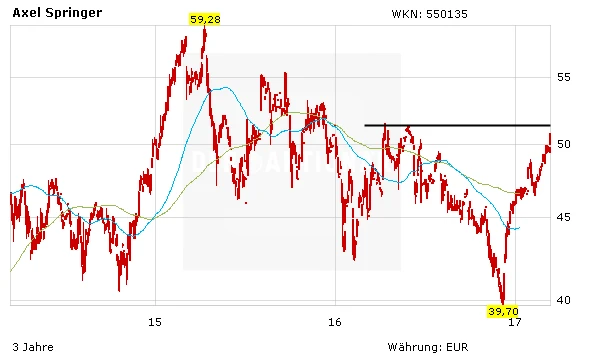 Die Springer-Aktie kann nach den Zahlen und dem positiven Ausblick am Donnerstag deutlich zulegen. Aus charttechnischer Sicht steht die Aktie kurz vor dem Sprung auf ein neues 52-Wochen-Hoch und damit vor einem neuen Kaufsignal. Darüber hinaus spricht natürlich auch die Dividendenrendite von rund 3,8 Prozent für die Aktie. Investierte Anleger lassen die Gewinne laufen und auch Neueinsteiger können zugreifen.