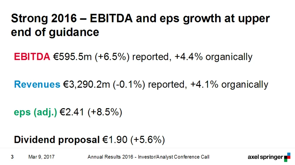 Wie Axel Springer am Donnerstag in Berlin mitteilte, ist das bereinigte EBITDA im Geschäftsjahr 2016 um 6,5 Prozent auf 595,5 Millionen Euro angestiegen. Damit liegt das operative Ergebnis am oberen Ende der Unternehmensprognose. Der Umsatz ist im Vergleich zum Vorjahr minimal zurückgegangen – um 0,1 Prozent auf rund 3,3 Milliarden Euro. Damit erfüllt der Medienkonzern auch die im August gesenkte Umsatzprognose.
