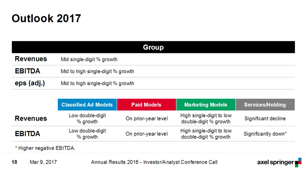 Speziell in den Bereichen Rubrikenangebote und Vermarktungsangebote rechnet das Unternehmen mit steigenden Erlösen, während der Umsatz im Segment Bezahlangebote stabil auf Vorjahresniveau liegen soll. Im Bereich Service/Holdings wird wegen rückläufiger Druckereierlöse und geringeren Mieteinnahmen dagegen mit einem deutlichen Umsatz- und Ergebnisrückgang gerechnet.