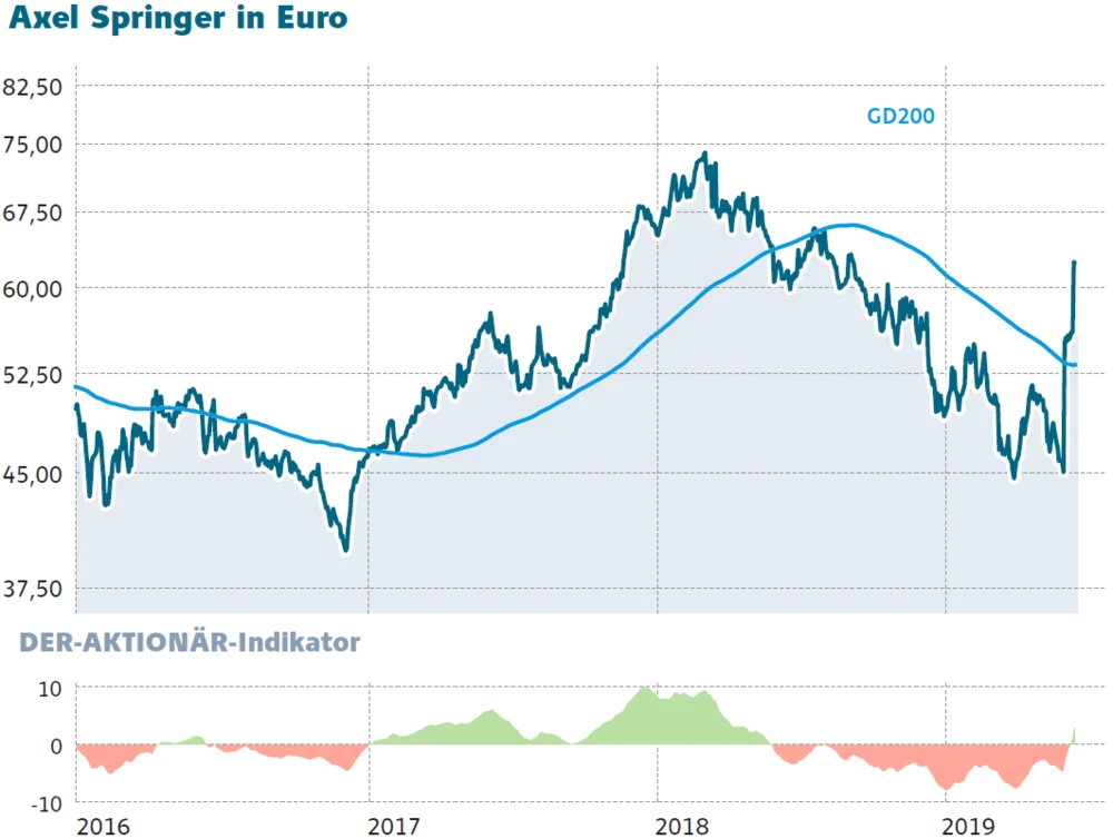 Das KKR-Angebot von 63 Euro entspricht einem knapp 40-prozentigen Aufschlag auf den Schlusskurs vom 29. Mai 2019. Tags darauf hatte Axel Springer die Gespräche über eine mögliche strategische Investition offiziell bestätigt. Die Aktie war daraufhin um bis zu 25 Prozent nach oben geschossen (DER AKTIONÄR berichtete).