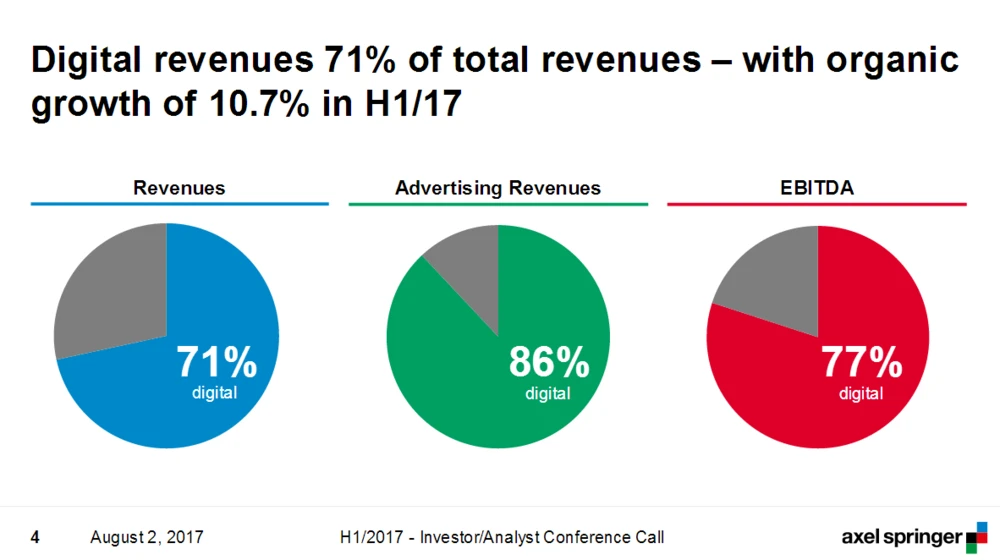 Im ersten Halbjahr 2017 ist der Konzernumsatz von Axel Springer um 6,9 Prozent auf rund 1,7 Milliarden Euro gestiegen. 71 Prozent davon, also rund 1,2 Milliarden Euro, hat der Medienkonzern dabei im Digitalgeschäft erwirtschaftet. Zum operativen Ergebnis (EBITDA) in Höhe von insgesamt 317,2 Millionen Euro haben digitale Aktivitäten rund 77 Prozent beigetragen. Bei den Werbeerlösen liegt der Digital-Anteil inzwischen sogar bei 86 Prozent.