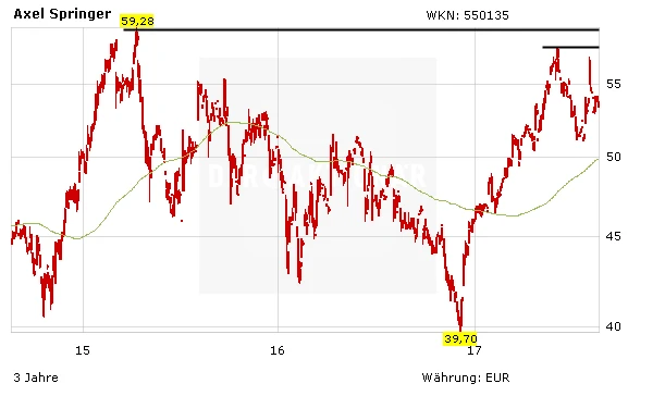 Unterstützt von den positiven Zahlen und der Prognose-Erhöhung konnte die Springer-Aktie Anfang August zwar kurzzeitig deutlich zulegen und das Mehr-Jahres-Hoch bei 57,70 Euro ins Visier nehmen, die Freude der Anleger währte aber nicht lange. Trotz positiver Analystenkommentare musste der Kurs die Gewinne in der Folge wieder abgeben. Das Allzeithoch im Bereich von 59 Euro bleibt aber in Sichtweite, weshalb investierte Anleger dabei bleiben und mutige Neueinsteiger weiterhin zugreifen können.