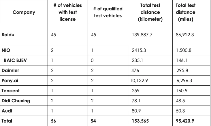 Insgesamt waren 56 Testfahrzeuge in Peking zugelassen, von denen 45 Baidu gehören. Auch bei der zurückgelegten Wegstrecke hat Baidu einen Vorsprung gegenüber NIO, BAIC, Audi und Co.