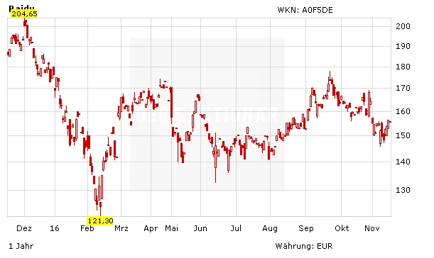 Seit Wochenstart konnte Baidu rund sechs Prozent zulegen. Jetzt steht die Aktie vor der 200-Tage-Linie bei 174 Dollar. An dieser Marke könnte der knapp zweimonatige Abwärtstrend brechen. Längerfristig befindet sich die Baidu-Aktie in einem Seitwärtstrend, der im Bereich von 140 Euro unterstützt wird und auf der Oberseite von den Hochs im April und September gedeckelt ist.