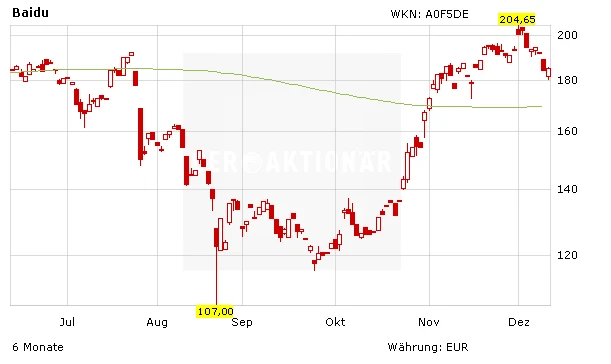 Das Chartbild der Baidu-Aktie hat sich in den letzten Monaten deutlich aufgehellt. Die Quartalszahlen konnten den Aufwärtstrend noch einmal deutlich beschleunigen. Mit dem starken Momentum im Rücken dürfte es in nächster Zeit weiter nach oben gehen. Als nächstes rückt der Widerstand bei 216 Dollar in den Fokus. Sollte ein Ausbruch darüber gelingen, wäre der Weg bis auf 226 Dollar frei. DER AKTIONÄR sieht noch ein Potenzial von 20 Prozent. Investierte Anleger bleiben dabei.