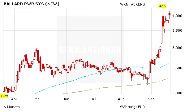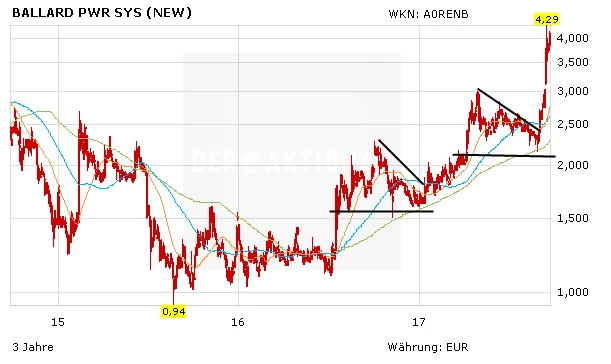 Die Aktie von Ballard Power hat in den letzten Tagen mit dem Ausbruch über den Widerstand von umgerechnet 3,00 Euro deutlich an Wert zugelegt. Mehrere positive News haben der Aktie Beine gemacht: