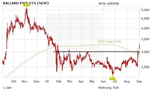 Damit gelingt Ballard Power ein weiterer Schritt bei der Optimierung des Produktportfolios. An den Handelsplätzen in Deutschland kann die Aktie rund zehn Prozent zulegen. Allerdings sind aufgrund des Labor Days die Börsen in den USA und Kanada heute geschlossen. Im morgigen regulären Handel muss die Ballard-Power-Aktie die heutigen Kursgewinne verteidigen, um das Kaufsignal (Ausbruch aus der monatelangen Seitwärtsbewegung) zu bestätigen. Generell bleibt die Ballard-Aktie eine aussichtsreiche Wette auf den Durchbruch der Brennstoffzellen-Technologie.