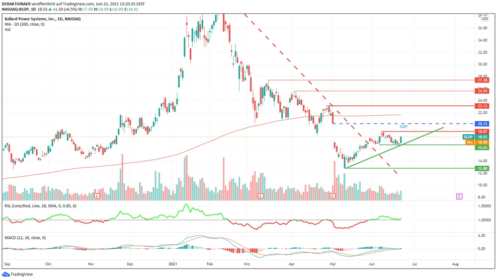 Zum Monatswechsel konnte die Aktie von Ballard Power den Abwärtstrend durchbrechen und sich stabil über der Unterstützung bei 16,65 Dollar halten. Der Titel erreichte vor zwei Wochen ein Zwischenhoch bei 18,86 Dollar. Diese Marke stellt aktuell einen Widerstand dar.